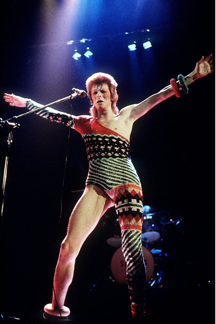 | David Bowie in 1973 on his Ziggy Stardust tour wearing a Kansai Yamamoto knitted jumpsuit. |